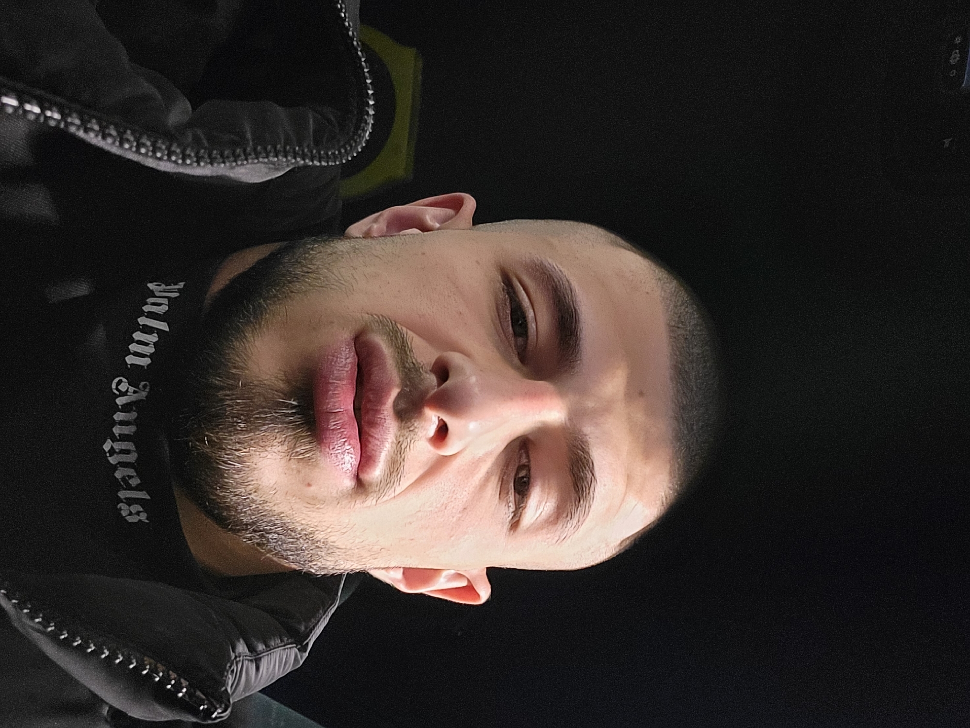 A man with short dark hair and a beard is positioned close to the camera. He is wearing a dark jacket and a black shirt with the words "Palm Angels" printed in white gothic font. The background is dark. The image does not provide specific information about Sofia, Bulgaria.