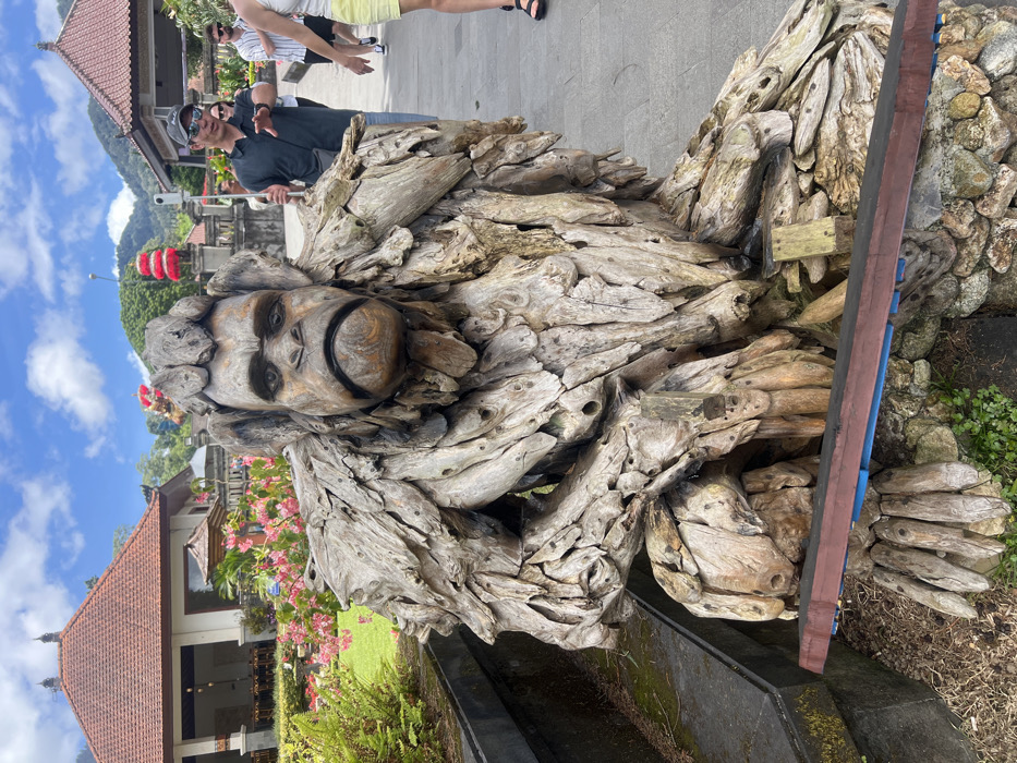 A large, weathered primate-like sculpture, constructed from numerous pieces of driftwood, occupies the foreground in Bedugul, Indonesia