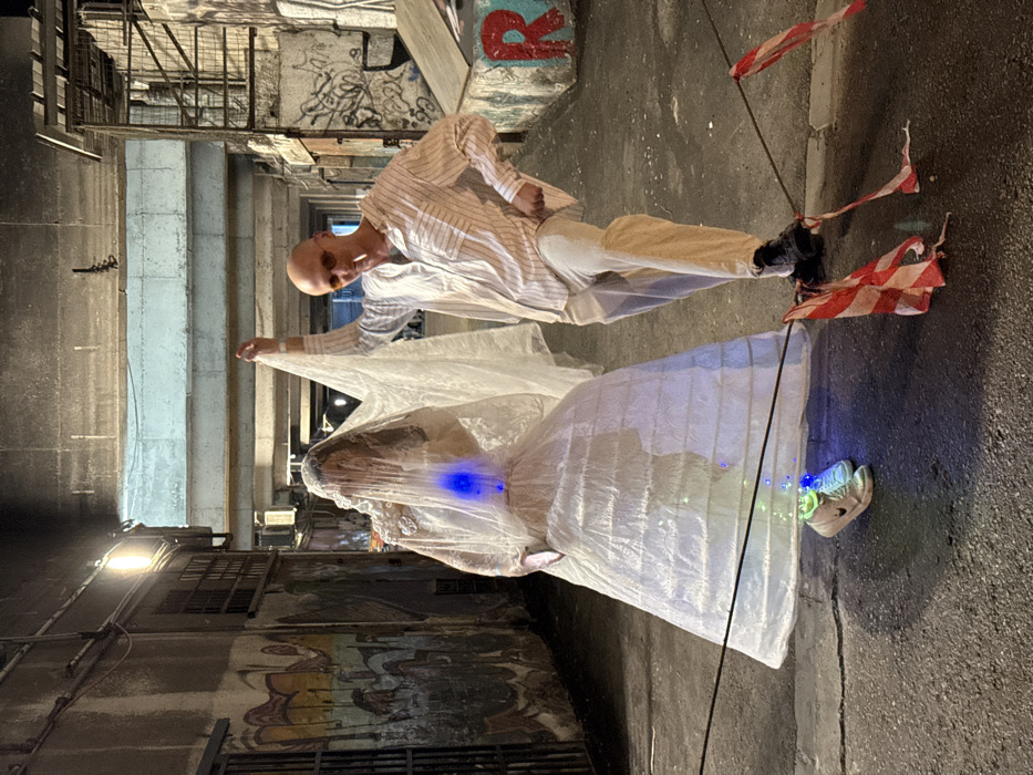 A bald person in a striped shirt and white pants poses with a person covered in a white plastic-like sheet and veil illuminated with blue lights. They are standing in a narrow alleyway with graffiti-covered walls. Red and white striped ribbons are attached to a pole near the person in the plastic sheet. The image is rotated.