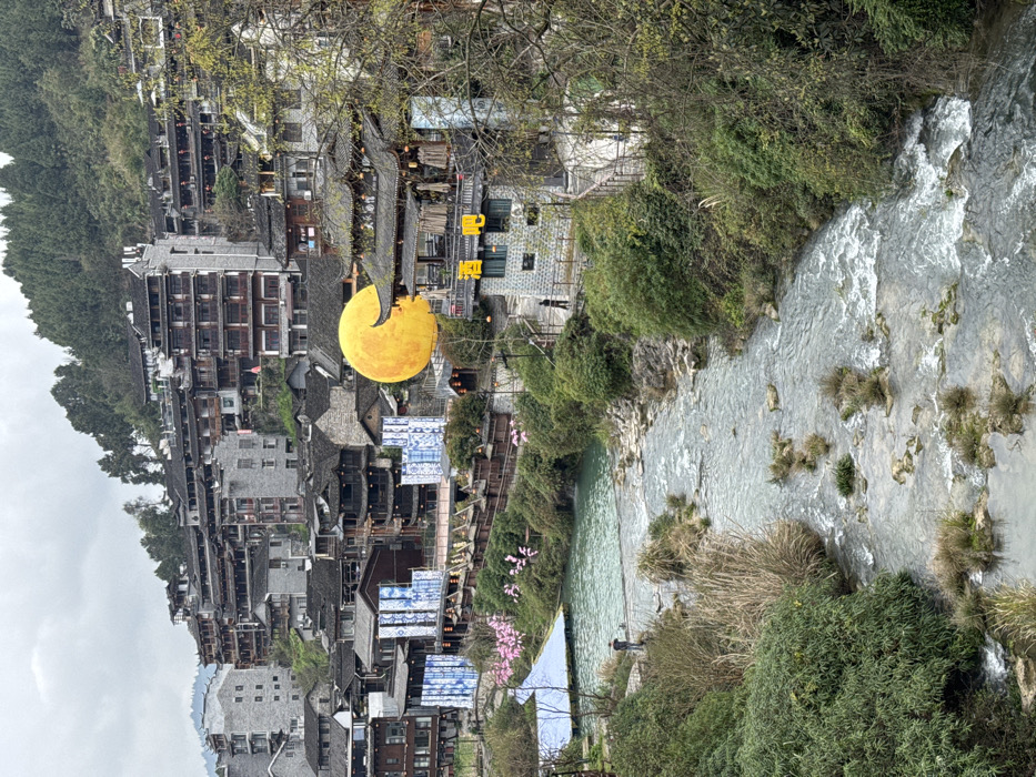 This image depicts a mountainous urban landscape in Furong, China, under an overcast sky. The scene is dominated by a river flowing from the upper left towards the lower right, with varying water clarity; upstream water appears greenish-blue, while downstream water is more turbulent with exposed rocks and vegetation. Buildings, primarily featuring traditional dark tiled roofs, wooden structures, and multiple stories, are terraced into the steep hillside, extending from the midground to the top horizon. Interspersed among these are some lighter-colored, more modern structures. A large, prominent, bright yellow spherical object, resembling a moon, is situated among the buildings in the midground, slightly right of center. To its left, several vertical blue and white patterned banners or screens adorn buildings along the river. Directly below these banners, pink floral decorations are visible along the riverbank. On the immediate right bank, a multi-level building with dark tiled roofs and an open-air upper level features the Chinese character "酒吧" (Jiu Ba - Bar) prominently displayed in yellow signage. Another building to its left bears "大堂客栈" (Da Tang Ke Zhan - Lobby Inn/Hostel) signage. Elevated walkways and wooden structures line the riverbanks, connecting various parts of the village. Two individuals are present in the scene: 1. One person, dressed in dark attire, stands on the left riverbank in the lower-midground, near the water's edge. A light blue tarp or cover is visible further upstream on this bank. 2. A second individual, also in dark clothing, walks along a paved path on the right riverbank, near the base of the building with the "酒吧" sign. The riverbanks are heavily vegetated with green bushes, trees, and some dry grasses. The surrounding mountains are densely forested with evergreen trees.