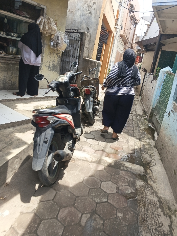 A narrow alleyway featuring two motorbikes is shown. One is red and black, closer to the viewer, and the other is further back. Two people wearing hijabs are present. One is looking into a building window, while the other is walking away down the alley, wearing a striped shirt and dark pants. The path is made of hexagonal paving stones. Buildings crowd on either side of the alley, painted in muted colors.