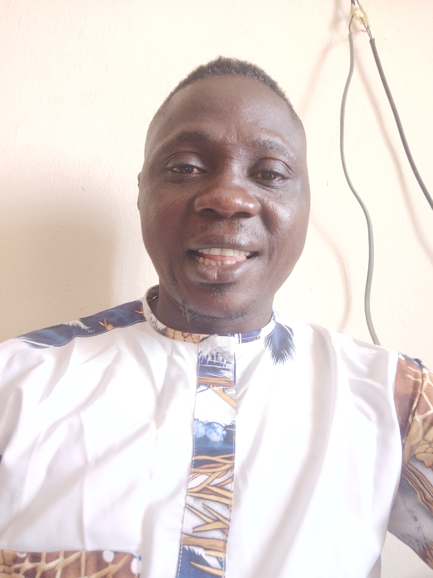 The image presents a close-up portrait of an adult male in Akwanga, Nigeria, positioned centrally and facing directly towards the viewer with a slight smile. The individual has dark skin and short, closely cropped dark hair. He is wearing a collared shirt; the main body is white, while the collar, shoulders, and a vertical strip on the front placket display a patterned fabric incorporating shades of blue, brown, and golden-tan in a design resembling foliage or abstract motifs. The background consists of a plain, light cream-colored wall. In the upper right quadrant of the image, two electrical wires are visible hanging from the wall; one is a thicker dark gray/black cable, and the other is a thinner wire secured with yellowish insulating tape.