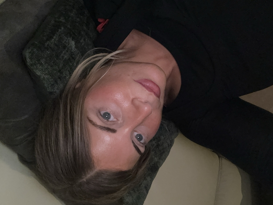 A woman with blonde and brown hair, blue eyes, and fair skin rests against a gray-green pillow. She wears a black long-sleeved shirt and looks upward towards the camera. The background features a light tan-colored surface. Her face is well-lit, and there are some dark shadows surrounding her.
