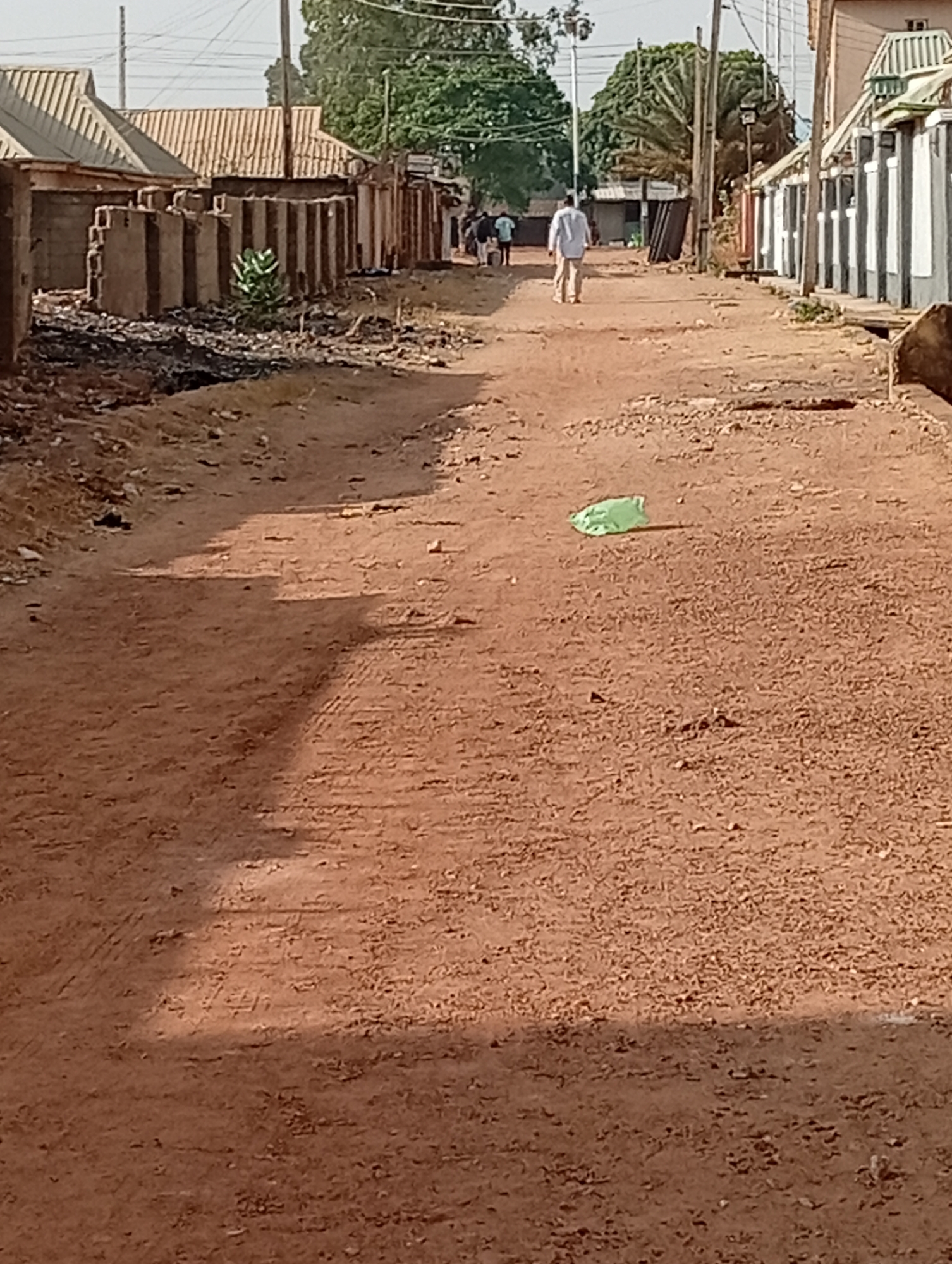 The image displays an unpaved, reddish-brown dirt road in Sabon Tasha, Nigeria, extending into the distance under a clear sky. On the left side of the road, a sequence of concrete block structures and partial walls are visible, alongside a pile of dark, burnt debris from which a small green plant emerges. Behind these structures, buildings with light-colored corrugated metal roofs are present. Further down the left, additional buildings and trees are partially visible. On the right side, a row of buildings, some characterized by light-colored walls with dark vertical stripes, borders the road, with a shallow drainage channel running parallel. Utility poles supporting multiple overhead power lines are positioned along both sides of the road. A male individual, wearing a light-colored long-sleeved shirt and light trousers, walks away from the camera in the middle of the road. Further in the distance, a small group of two to three people is discernible on the left. A crumpled light green plastic bag lies on the dirt road in the mid-ground. The road surface is uneven, showing tire tracks, minor undulations, and scattered small stones. The scene is illuminated by daylight, casting shadows.