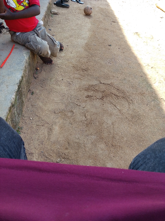 This image depicts an outdoor scene in the city of Unknown, Unknown, taken from a low perspective. In the foreground, the lower thighs and knees of an individual wearing blue denim jeans and a purple garment are visible. To the left, a person, likely a child, is seated on a raised concrete ledge. This individual wears a red t-shirt with a yellow graphic and light brown cargo pants, with bare feet visible, one partially covered by a dark sandal. An orange-red flexible rod or stick rests on the concrete ledge beside them. The ground is unpaved, consisting of light brown sand or dirt, exhibiting disturbed areas and faint impressions. Further into the midground, a light brown, spherical object resembling a dried coconut or handmade ball lies on the sand. Two dark sandals or slippers are visible on the ground behind this object. Strong sunlight illuminates the scene from the upper left, casting a distinct diagonal shadow across the right side of the sandy ground.