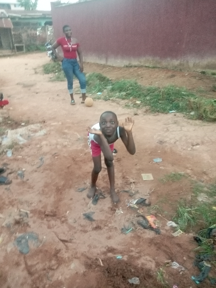 The image depicts an outdoor scene in Ogidi, Nigeria, on an unpaved reddish-brown dirt surface. In the foreground, a barefoot child of dark complexion, wearing a white sleeveless top with red trim and red shorts, is crouched forward with wide eyes and both hands raised near their head. Behind and to the left of the child, an adult female of dark complexion stands with her body slightly angled to the left. She wears a red off-the-shoulder top with white text and blue jeans cropped above the ankle. A light-colored, spherical object resembling a deflated ball rests on the ground between the child and the adult. Scattered black and white plastic bags, wrappers, and other debris are visible on the ground throughout the lower portion of the frame. In the mid-ground, behind the adult female, a solid dark reddish-brown wall spans horizontally. Patches of green vegetation are visible along the base of this wall and on the ground. In the far background to the left, a white motorcycle is partially visible next to obscured building structures with light-colored walls and corrugated roofs.