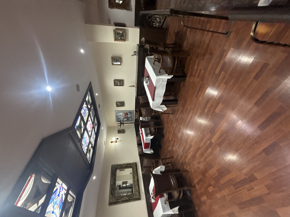 The image depicts an unoccupied interior dining area within a restaurant or tavern located in Blagoevgrad, Bulgaria. The room features polished, medium-brown hardwood flooring. Walls are a light beige above a dark wooden wainscoting or paneling. The white ceiling contains multiple recessed spotlights and two distinct, dark wood-framed structures incorporating stained-glass panels with geometric and abstract patterns in shades of blue, red, yellow, and green. Several rectangular dining tables are visible, each draped with a white tablecloth and a contrasting red runner. White condiment shakers are centrally placed on each table. Dark wooden chairs, some with armrests and upholstered seats, are arranged around the tables. On the left wall, a large mirror with a textured, possibly carved, wooden frame reflects a portion of the room. Multiple framed artworks, including a prominent painting depicting a figurative scene, are hung on the walls. An antique-style wall sconce provides additional illumination. A long, dark wooden console or buffet lines the back wall, displaying decorative items such as a small animal figurine. A dark, ornate metal railing, potentially part of a staircase or partition, is partially visible on the far right. No individuals are present, and no actions or interactions are depicted.