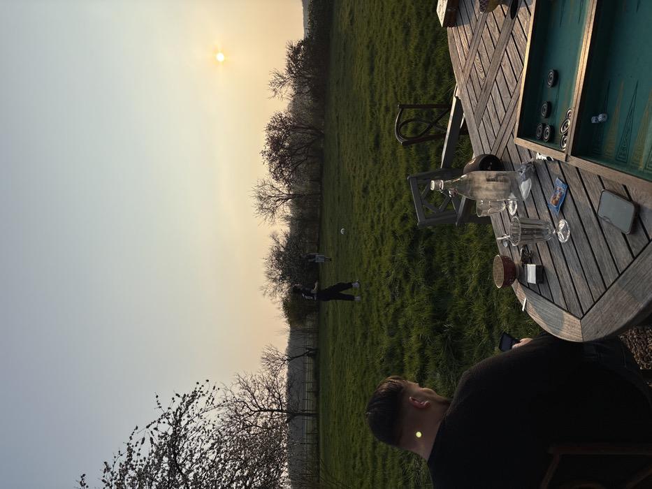 An outdoor scene in Bû, France, depicts a golden hour setting with a low sun visible on the right horizon. In the foreground, a male with short dark hair, wearing a dark long-sleeved shirt, is seated with his back to the viewer at a weathered wooden octagonal patio table. He is looking down at a smartphone in his hands. The table holds a clear glass bottle, two empty patterned glasses, a small lighter-colored smartphone, an empty brown ceramic bowl, a small metal tin, a partially visible Marlboro Red cigarette pack, a small blue package, and an open green-lined backgammon board containing black checkers and two white dice. A wooden chair is pulled away from the table on the right. In the midground, a large, well-maintained grassy lawn extends, where two individuals are present. One individual, positioned left of center, wears dark clothing and light shoes, appearing to be engaged with a white soccer ball situated on the grass in front of them. The second individual stands further back and to the right, wearing lighter clothing. The background features a dense line of deciduous trees and bushes, some with emerging foliage, demarcating the end of the grassy area. A fence line is partially discernible behind the vegetation. The sky displays a gradient from light blue at the top to a warm orange-yellow near the horizon, where the circular bright yellow sun is prominent on the right.