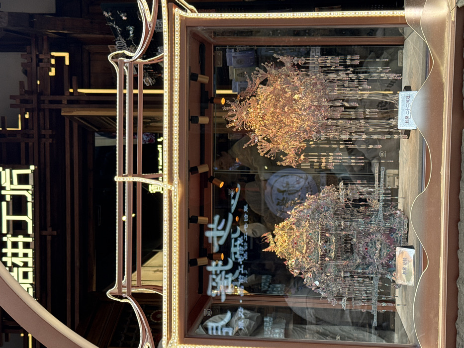 A vertical shot showcases a display case, likely a shop window, featuring ornate floral arrangements. Two main arrangements are visible, shimmering with metallic tones. The case's structure is illuminated with LED lights, and wine bottle holders are seen. Reflections on the glass reveal other objects, including the photographer. Chinese characters, seemingly the shop's name, are seen on the window. The outside structure is decorative, adding to the storefront's aesthetic.