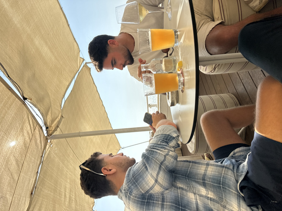 - "The image depicts two young adult males seated at a white round table under a beige fabric canopy, with the Mediterranean Sea visible in the background under a clear blue sky, identifying the location as a coastal area in Herzliya, Israel" by FM-VbiQq1, licensed under CC BY 4.0
