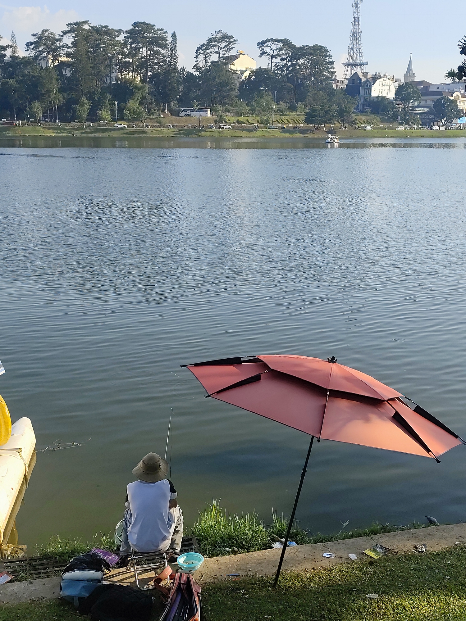A medium-shot depicts a man fishing from the shore of a lake. The man is sitting on a small folding chair, wearing a light-colored hat and shirt, and is facing away from the viewer. He is holding a fishing rod, which extends out over the water. Beside him is a red umbrella, and various fishing-related items, including bags and a small bowl. The lake is calm with slight ripples, and the opposite shore is visible in the background. The background features buildings, trees, and a tall communication tower, indicative of an urban setting. Based on architectural elements and location context, this scene is likely in Da Lat, Vietnam. The shoreline in the foreground shows signs of light littering.