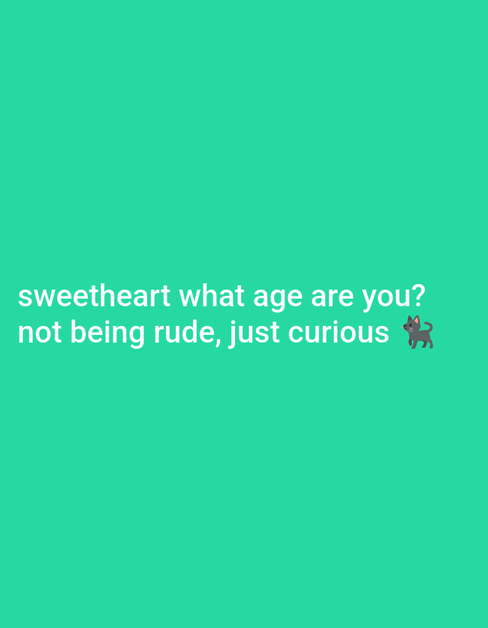 The image displays white text rendered on a solid, uniform teal background. The text, centered horizontally, occupies the lower portion of the frame. The first line reads "sweetheart what age are you?". The second line reads "not being rude, just curious" and is immediately followed by a grey cat emoji. There are no discernible visual elements, landmarks, or geographical identifiers within the image to indicate a specific location in the city of Cape Town, South Africa, or any other physical environment; the scene is purely textual content on a color field.