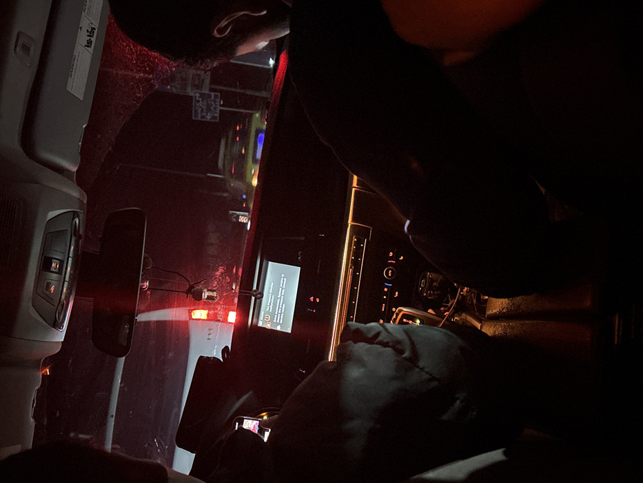 Inside a vehicle at night, a passenger uses a phone. The dashboard glows with illuminated buttons and a screen displaying text. Outside, the red taillights of a truck are visible, blurred by motion, along with other distant lights. The overall scene is dimly lit, with much of the interior shrouded in shadow.