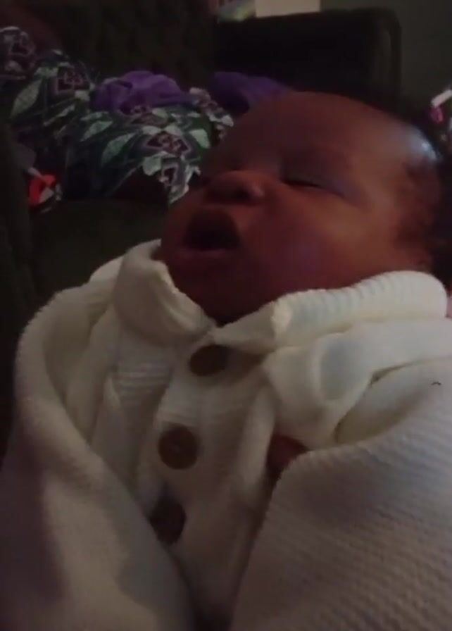 A baby wearing a white sweater is being held. The baby's eyes are closed and its face is slightly puffy. In the background, there is a green couch, a dark curtain, and various objects on a table. There are several items on the table including a clear water bottle, a red object, and a black box. The room appears to be a living room, dimly lit. The camera is at eye level and remains mostly still.