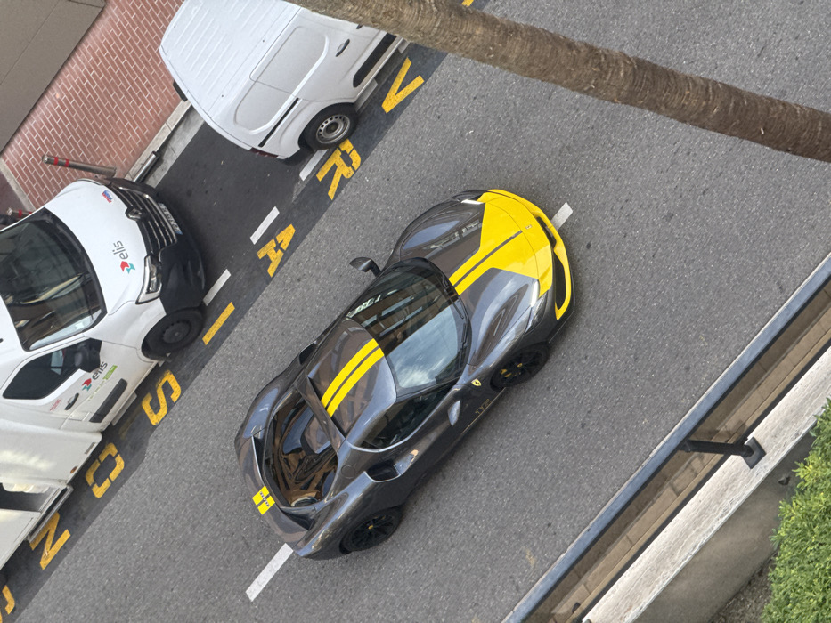 An overhead view captures a street scene in the city of Monaco, Monaco, during daylight hours. The central subject is a dark grey Ferrari 296 GTB sports car, positioned on an asphalt road marked with white lines. The Ferrari features a prominent bright yellow stripe originating from the front bumper, extending over the hood, roof, and splitting into two thinner stripes over the engine cover. Its black multi-spoke wheels are fitted with yellow brake calipers. A small yellow "296 GTB" inscription is visible on the lower front fender. To the left of the Ferrari, a large white "elis" branded Renault Master van is parked in a designated zone, facing away from the viewer. Its driver's side door is open, revealing the interior. The van displays a French license plate, "F 249 JS". Further to the right, partially visible, is a smaller white van, likely a Peugeot Partner, also parked. The road surface features various yellow painted markings, including numbers and letters such as "24S", "24M", "7A", and "7S", indicating specific zones or instructions. Adjacent to the parked vans, a reddish-brown brick-patterned sidewalk is visible, featuring red and white bollards. The image is taken from an elevated perspective, with a black metal railing, a concrete ledge, and green shrubbery visible in the lower left foreground. A segment of a palm tree trunk is present along the right edge of the frame. No individuals are visible in the scene.