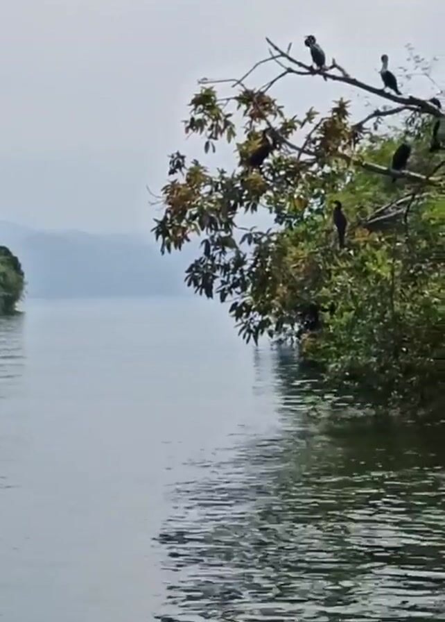 The video depicts a view of a body of water, possibly a lake, with a tree extending over the edge of the water. Several black birds are perched on the branches of the tree. In the distance, there appears to be land or possibly mountains on the far side of the water. The sky is overcast, with a light grey color. The water has ripples on the surface, indicating a slight breeze.