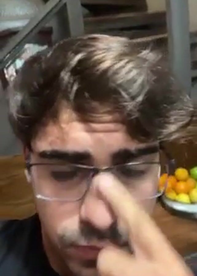 A man wearing glasses and earbuds looks at the camera. He touches the bridge of his glasses with his finger, then touches his jaw. A wooden staircase is in the background, and a plate of fruit is on the table. He is wearing a black t-shirt.