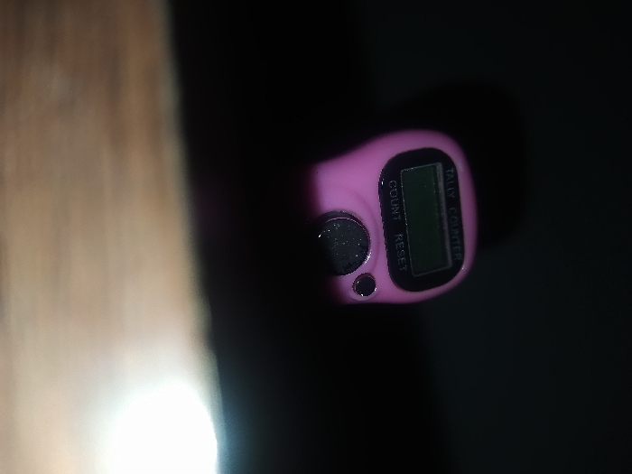 The image depicts a pink digital tally counter positioned in a dimly lit environment