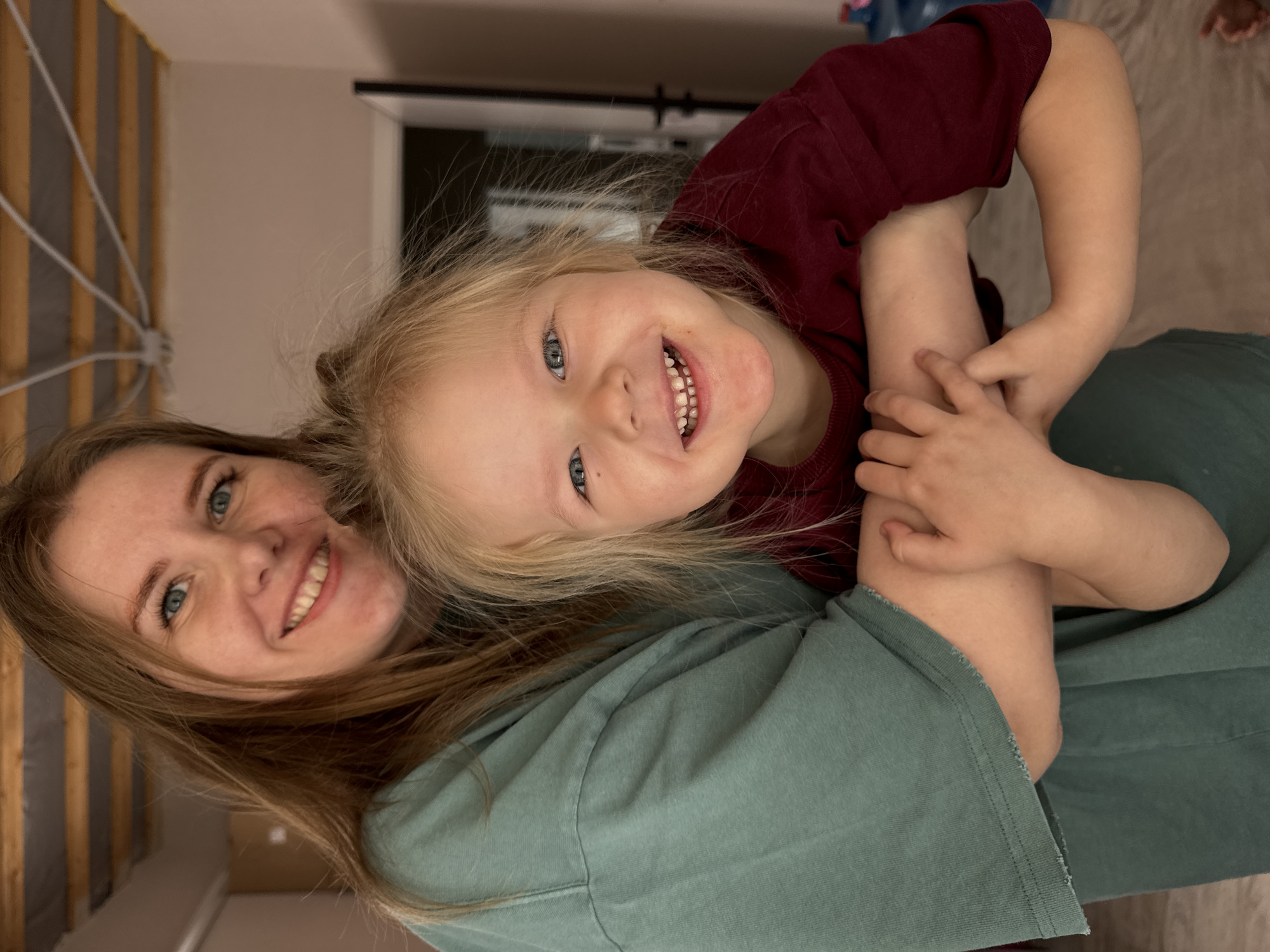 A young woman and a young child, possibly a mother and daughter, are smiling closely at the camera. The woman has light brown hair and is wearing a teal shirt. The child has blonde hair and is wearing a maroon shirt, her arms wrapped around the woman. The background includes a doorway and what appears to be a partially constructed wall. The location is potentially Gornyi (Dvurechenskoe S/P), Russia.