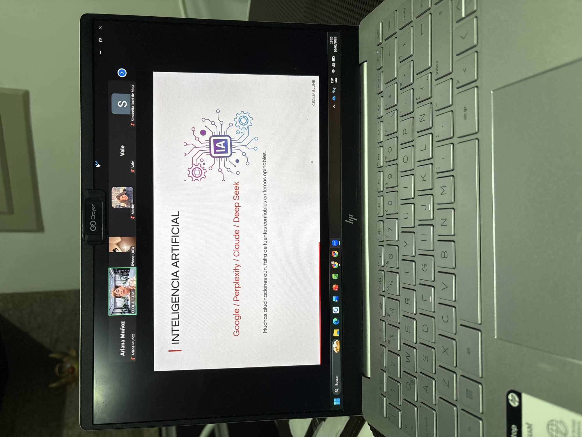 A laptop is open, displaying a Zoom video conference call with multiple participants. The central screen shows a presentation slide titled "INTELIGENCIA ARTIFICIAL" and discussing Google, Perplexity, Claude, and Deep Seek. Participant names, including Ariana Muñoz, Vale, Simonetta Loret de Mola, Meche, and Cecilia Blume, are visible in the call's participant list. The laptop is an HP model and the OS appears to be Windows. The laptop keyboard and adjacent surroundings are visible, including a few icons on the screen, and the system clock displaying the date as 30/03/2026 and time as 19:20. There is no indication of the city of San Isidro, Peru within the image.