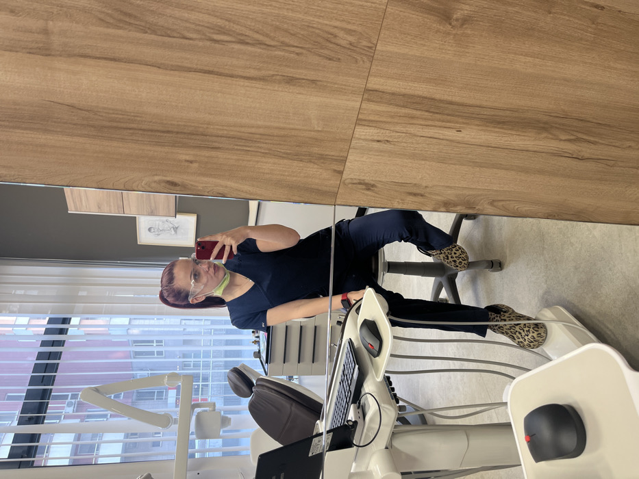 A young adult female is depicted taking a selfie in what appears to be a dental clinic in Sofia, Bulgaria