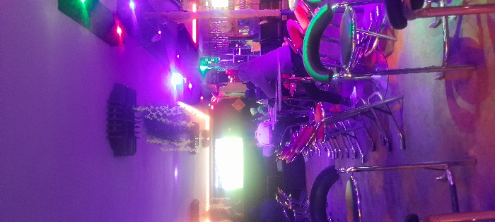 The image depicts an indoor bar or lounge environment located in the city of Chevaywa ward, Kenya. The scene is characterized by predominant purple ambient lighting, augmented by accentuating green and red LED strip lights on the ceiling and walls. In the foreground and mid-ground, numerous tall, chrome-framed bar stools with seats of varying colors (red, green, black) are arranged around circular chrome tables. Three individuals are visible: one person wearing a grey hooded top is seated with their back to the viewer at a table in the mid-ground. Further back, another individual in a light-colored top is seated at a similar table, with a third person partially obscured behind them. A large, illuminated flat-screen television is mounted on the far wall, displaying bright, possibly dynamic, content. Above, a ceiling-mounted ventilation unit is present, with artificial white and green foliage suspended beneath it. The background features a bar area with visible bottles and shelving, illuminated by colored lights. The floor is a hard, concrete-like surface, reflecting the intense colored lighting.