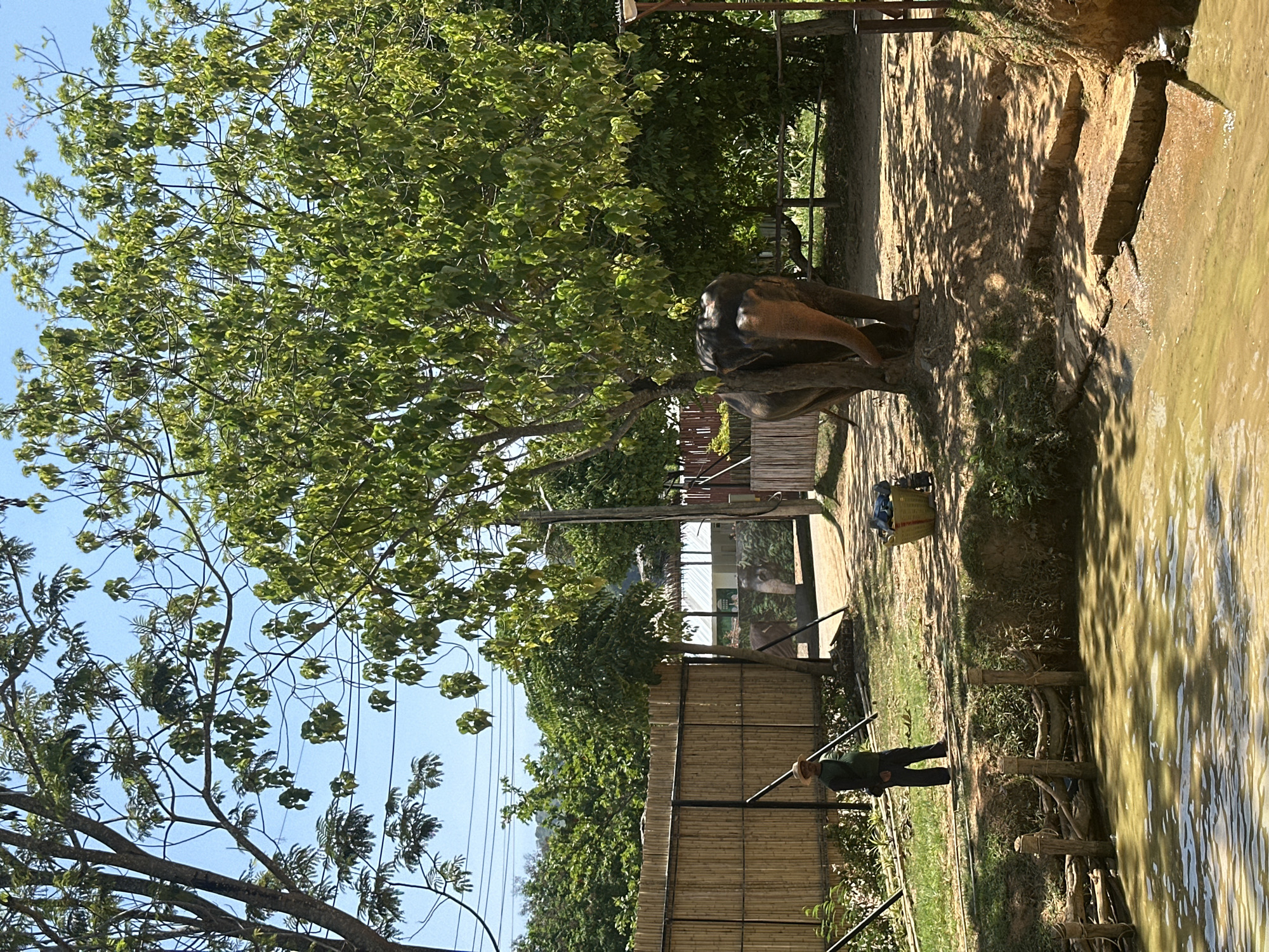 The scene depicts an outdoor elephant sanctuary or park setting within the district of Kathu, Phuket, Thailand, under a clear blue sky with bright sunlight. In the center-right of the frame, an adult Asian elephant with dark grey skin and reddish-brown coloration on its head and trunk stands next to a tree with lush green foliage. To the left of the elephant, further back from the water's edge, a male individual, appearing to be an adult, stands facing right. He wears a dark green long-sleeved shirt, dark trousers, and a light-colored straw hat. Between the man and the elephant, positioned on the dirt ground, is a woven basket, possibly light green or yellow, containing blue fabric or items. The foreground features a body of murky brown-green water with visible ripples. Along the left edge of the water, a crude wooden barrier constructed from posts and logs is visible. On the right side of the water, partially submerged, are several irregular stone steps leading down into the water. Behind the man, a tall bamboo fence with dark metal supports extends leftwards. In the background, beyond the fence and trees, additional green foliage, utility poles with wires, and a partial view of a building with a thatched roof and an elephant mural on a wall are discernible. The ground throughout the scene is predominantly dirt and sparse grass, showing signs of wear and erosion near the water's edge.