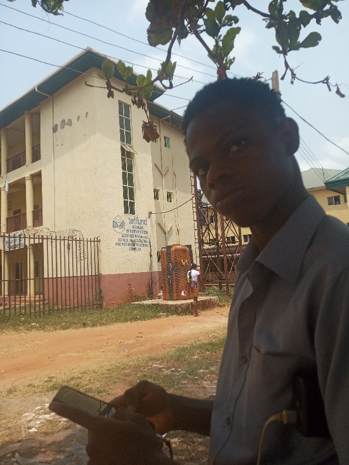 The image captures an outdoor scene in Nsugbe, Nigeria, dominated by a large educational facility