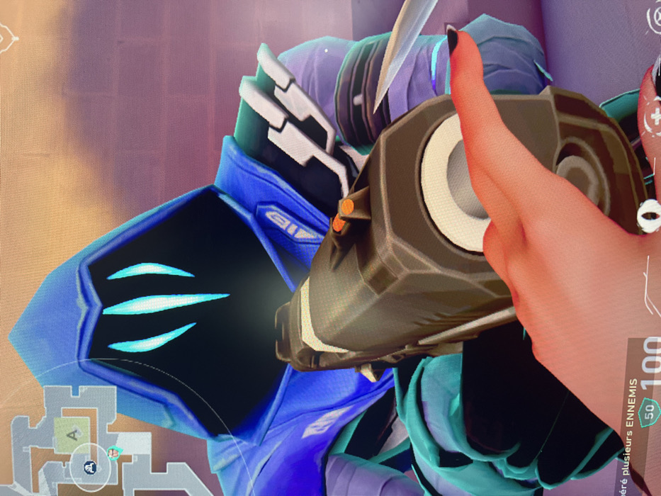The image displays a first-person perspective from a video game, captured from a screen. In the immediate foreground, a light-skinned hand with black nail polish on visible fingers grips the handle of a dark-colored semi-automatic pistol, which is aimed directly forward with its barrel and muzzle visible. The pistol features orange-dotted rear sights. Behind the pistol, a hooded character, identifiable as Omen from Valorant, stands centered. This character wears a blue and teal outfit with armored elements and a dark, featureless face from which three vertical, glowing cyan slits emanate. The background environment is a stylized, indistinct virtual setting with hues of purple and orange, showing subtle brick-like textures on the right. User interface elements are present: a minimap with an "A" label and player icon is in the top-left corner; health and shield indicators ("50" and "100") are in the bottom-left, partially obscured by French text reading "pé plusieurs ENNEMIS"; and partial weapon or ability icons, including a prominent eye symbol, are in the bottom-right. A faint white crosshair is visible in the center. The image contains no visual elements indicating a specific real-world location, including the city of Caen, France.