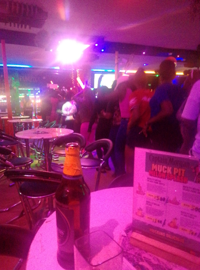 In a nightclub, a bottle of beer and a glass sit on a round table. A menu for "Captain Morgan Muck Pit Melon Splash" stands beside them. In the background, people dance under vibrant pink and blue lights. Metal chairs surround other tables in the club. The word "Purity" is faintly visible above the crowd.