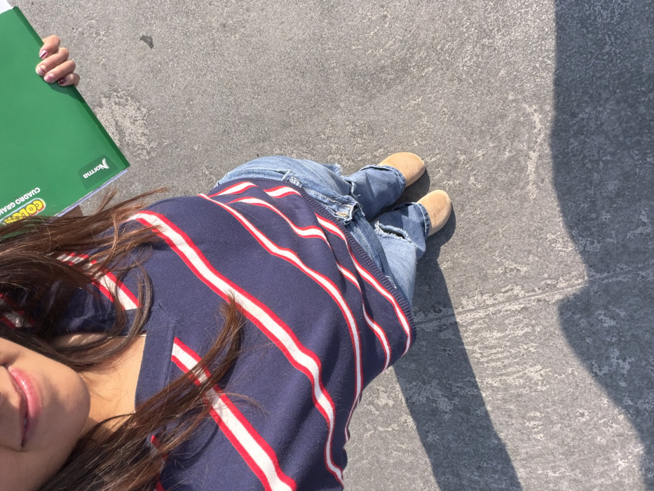 person lying on a textured concrete surface, wearing ripped blue jeans and tan-colored shoes. They are wearing a navy blue top with horizontal red and white stripes. A green notebook is held up in their left hand. A shadow stretches across the concrete beside them. Their hair is dark brown. A portion of their face, including lips, is visible.