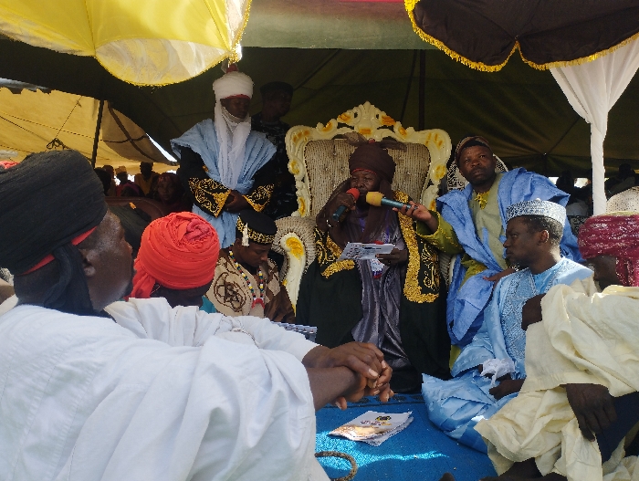 The scene takes place under a canopy in the city of Chum, Nigeria (latitude: 9.706, longitude: 11.713). There are seven men seated on a blue tarp. The man in the center, wearing a black robe with gold trim, is speaking into a microphone. He is wearing a traditional cap and is holding a piece of paper. The man to his right, wearing a blue robe, is listening intently. The man to the left, wearing a white robe, is leaning forward and holding a microphone. There are several other men in the background, some are standing, some are seated. They are all wearing traditional clothing. There is a large, ornate chair behind the man in the center. The canopy is supported by poles, and there is a yellow umbrella in the top left corner of the image. There are various other objects scattered throughout the scene, including a piece of paper, a microphone, a microphone stand, and a chair.
