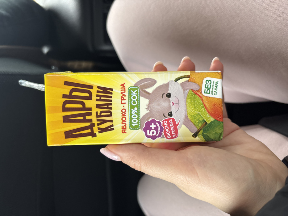 A hand holds a yellow juice box with Cyrillic text reading "ДАРЫ КУБАНИ" (Gifts of Kuban)