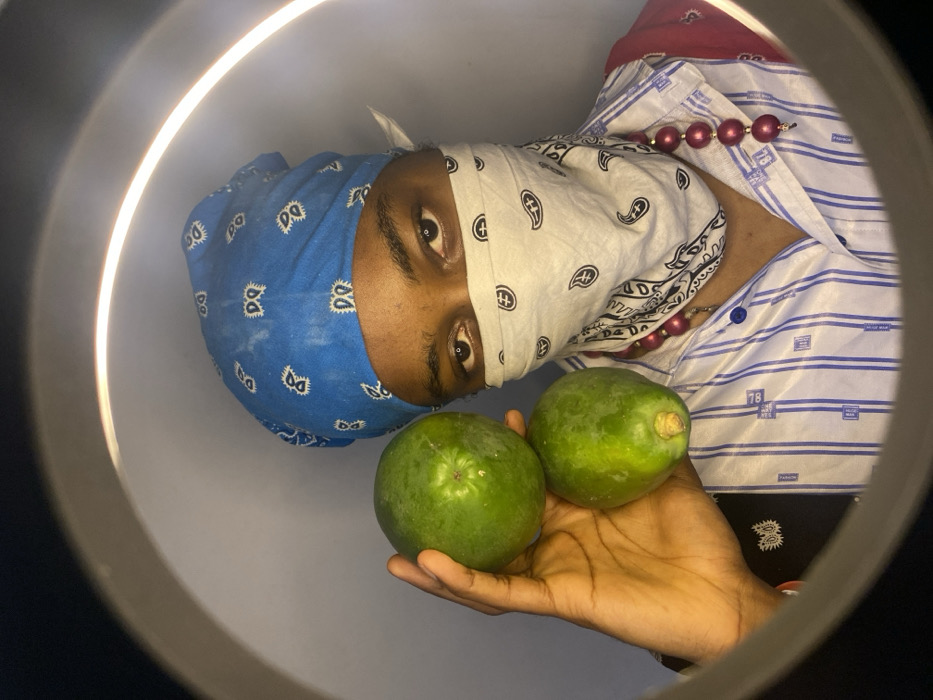 An individual is depicted in a close-up portrait, framed by a circular light source, located in Ngleshi Amanfro, Ghana. The subject wears a blue bandana with white patterns on their head and a white bandana with black paisley patterns covering their lower face, with only their dark eyes and eyebrows visible. They are dressed in a striped blue and white collared shirt and a necklace of large maroon beads. In their left hand, they hold two green, unripe fruits, consistent with papayas, near their face. The background is uniformly dark, and the subject directly faces the camera.