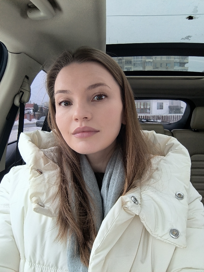 A female individual, approximately 20-35 years old, with light brown hair and eyes, is depicted in a front-facing selfie photograph. She is seated in the front passenger seat of a vehicle, which features a beige headliner and a visible sunroof. She is wearing an off-white padded winter jacket with a hood, a dark garment underneath, and a light grey scarf. Through the front passenger side window, a winter street scene is visible, characterized by snow-covered ground, leafless trees, and low-rise residential buildings with fences. A dark-colored vehicle is partially visible parked on the street. Through the rear window of the vehicle, a multi-story residential building, consistent with an apartment complex such as the Zhylyi kompleks "Komfort" (Residential Complex "Comfort") at Mykola Ovodova Street 20B, is visible in the distance. The scene is located in a residential area of Vinnytsia, Ukraine, under overcast skies.