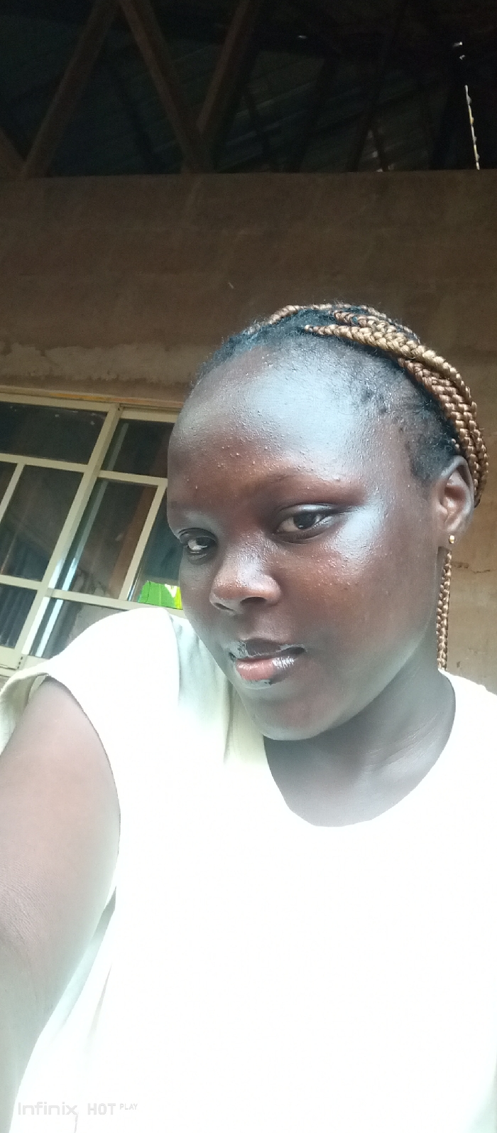 A close-up shot depicts a woman with dark skin and braided hair. She wears a light-colored shirt and has visible earrings. The background shows a window with a light-colored frame and what appears to be part of a building's structure, possibly roofing beams. The lighting in the image is a bit harsh, and the bottom of the frame includes a small watermark or text that reads "Infinix HOT PLAY."