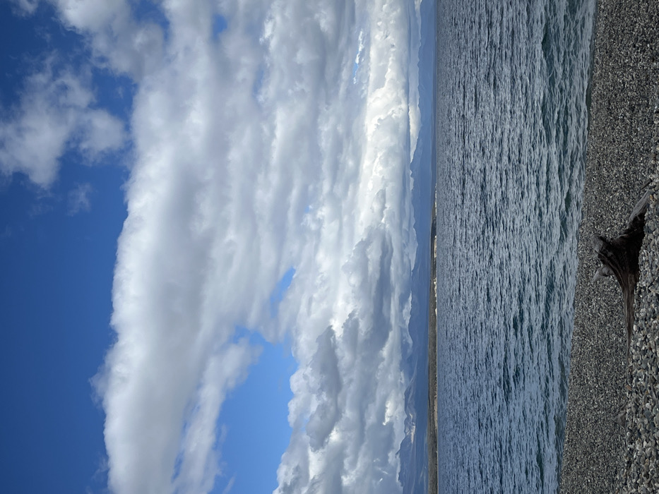The image displays a panoramic natural landscape in Municipio de Tolhuin, Argentina, presenting a view across a body of water. The foreground consists of a dark grey pebble beach, upon which a single piece of dark, gnarled driftwood rests horizontally in the lower center. The midground is occupied by expansive dark blue water, exhibiting numerous surface ripples. In the background, a distant landmass features a light-colored shoreline on the left, leading to a range of dark, undulating mountains or hills stretching across the horizon. The sky is partially clear blue, predominantly covered by numerous large, white to grey cumulus clouds. No people, structures, or specific actions are visible in the scene.