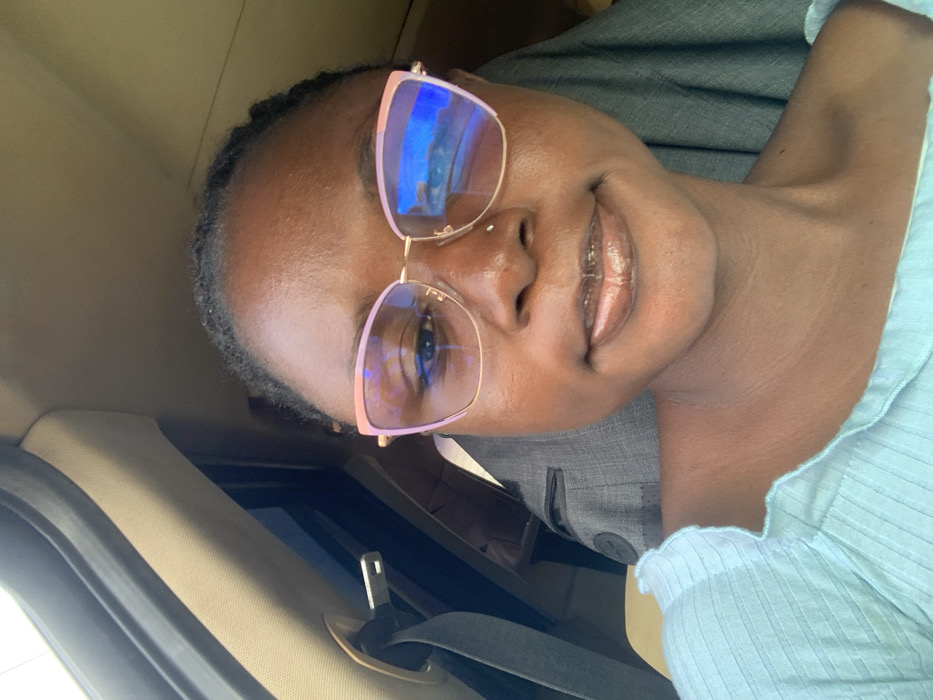 A dark-skinned woman wearing pale pink eyeglasses with a gold frame smiles in the driver's seat of a car