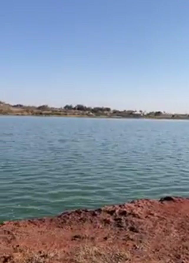 The camera pans across a lake and its rust-colored shoreline on a bright, sunny day