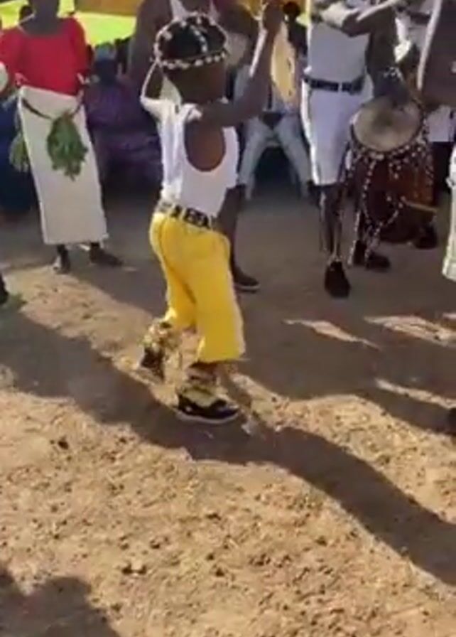 group of people gathered outdoors, likely at a festive event or celebration. A young child, dressed in a white tank top, bright yellow shorts, and adorned with beaded accessories, dances in the foreground. Surrounding the child are several adults, most of whom are wearing white attire and playing drums. The group is situated on a dirt ground under a canopy decorated with colorful fabric. In the background, more people are seated and watching the performance.
