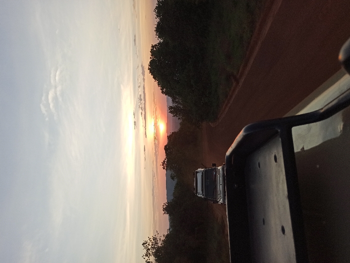 Captured from within a vehicle, the photo showcases a vibrant sunset. Orange and pink hues illuminate the horizon, partially obscured by silhouetted trees. Another vehicle trails behind, its presence adding depth to the landscape. The foreground displays part of the vehicle from which the photo was taken, providing a sense of perspective. The scene evokes a feeling of adventure and exploration.