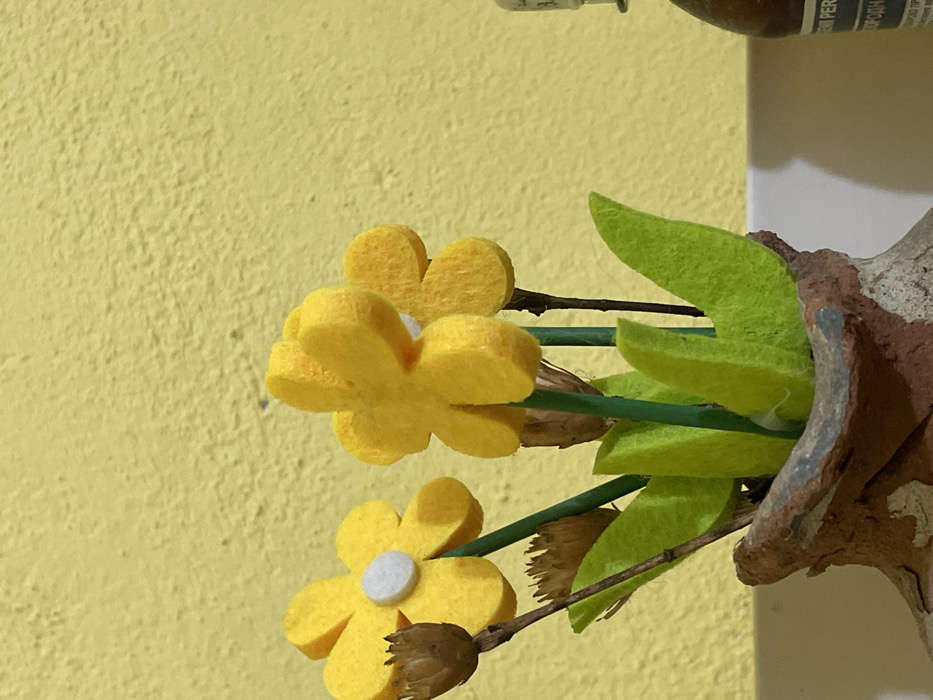 - "This image, taken in Troyan, Bulgaria, depicts a close-up of a decorative arrangement featuring artificial felt flowers and dried botanical elements in a rustic pot, set against a textured yellow wall" by FM-vu0TS2, licensed under CC BY 4.0