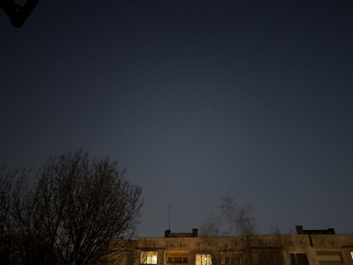 An exterior long shot at night shows an urban environment in Sofia, Bulgaria. The upper two-thirds of the frame are dominated by a dark navy blue sky, in which multiple stars are visible, including a distinct cluster resembling Orion's Belt and sword in the upper-left quadrant. The lower third of the image features the upper portion of a multi-story building and several trees. A large, dark-toned deciduous tree, bare of leaves, occupies the lower-left foreground, its branches extending upwards and to the right. The building, an older structure with a flat roof and what appear to be multiple chimneys on the right, spans horizontally across the lower frame. Its exterior is light-colored, possibly stucco or concrete. A thin, dark, vertical antenna-like rod protrudes from the roofline near the center of the building. Two windows on the building's facade, located on the far left and center-left, emit a warm, yellow light, indicating interior illumination. A second, lighter-toned tree, also bare, is partially visible behind the roofline towards the center-right. No individuals or active interactions are visible.