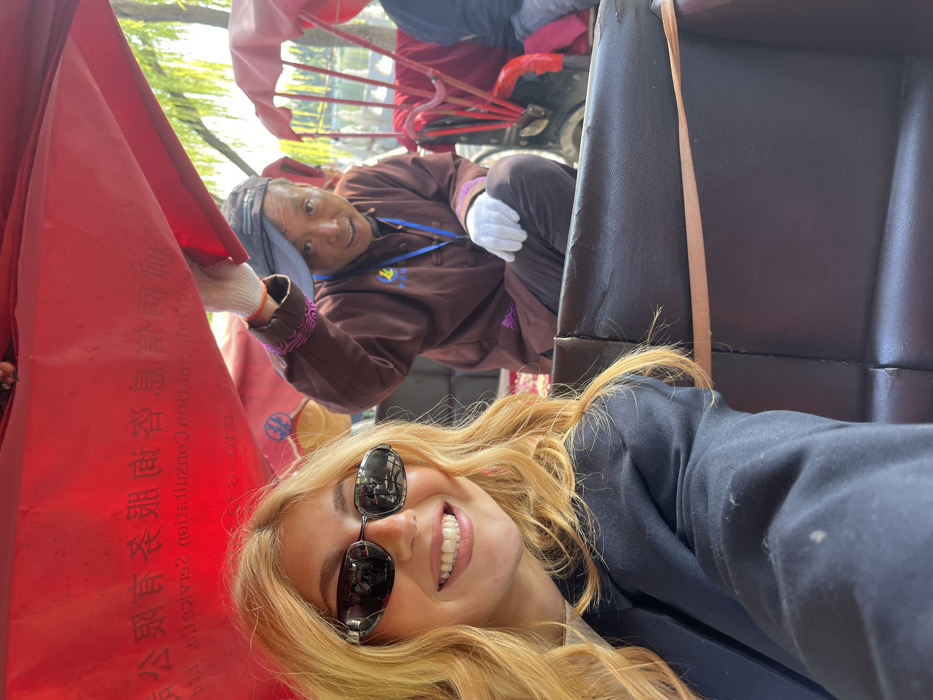 The image depicts a close-up view from inside a red-canopied rickshaw in Xicheng District, China, on a sunny day
