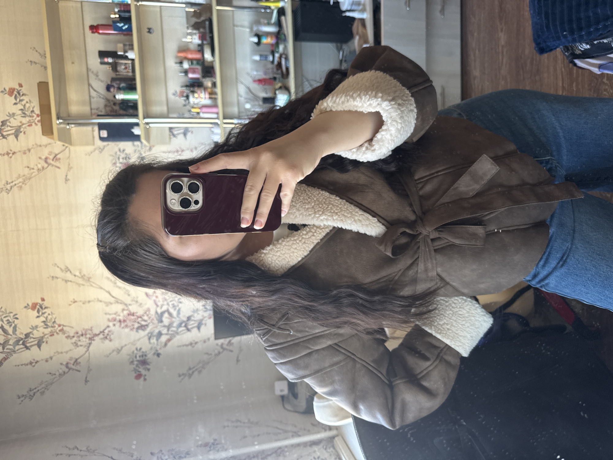 A person takes a selfie in a room. The person is wearing a brown jacket with white faux fur trim and blue jeans. The phone is a burgundy color and has a decorative case. The background includes a shelf with various items, a floral wallpaper, and a partially visible black surface. No evidence indicates this photograph was taken in Kurovskoye, Russia.