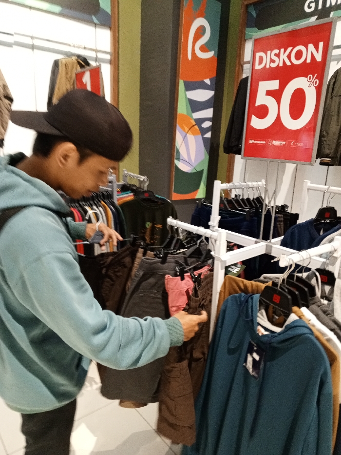 A person wearing a black cap and a blue-green hoodie shops for clothes in a store. They are looking at a rack of garments, seemingly shorts or pants, displayed on a white, multi-tiered rack. A large red sign that says "DISKON 50%" is visible behind the racks. A tall, colorful abstract art piece is also behind the racks. Other clothes hang on the racks nearby.