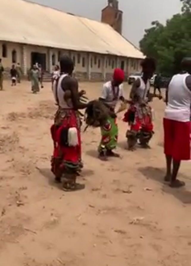 In a medium shot, a group of six men perform a cultural dance in a sandy courtyard, against the backdrop of a church with a tall, square tower