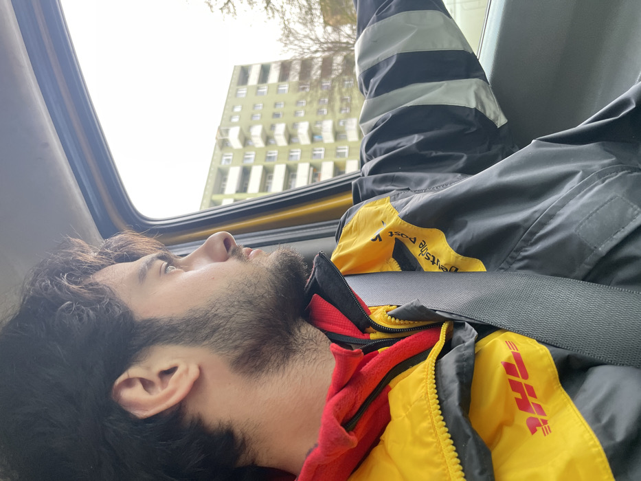 A male individual with dark hair and a beard is depicted in profile from the chest up, seated inside a vehicle and looking out through a side window. He wears a dark grey and black jacket with reflective armbands, layered over a yellow jacket displaying the red "DHL" logo on the left chest and "Deutsche Post" text on the right side. A red garment is visible beneath the yellow jacket at the collar. A black seatbelt is fastened diagonally across his chest. The vehicle's interior features a yellow trim around the window frame. Outside the window, under an overcast sky, a light green multi-story residential building with white balconies is visible. Bare tree branches are present in the lower right portion of the external view. The scene is set in a residential area within the city of Nuremberg, Germany.