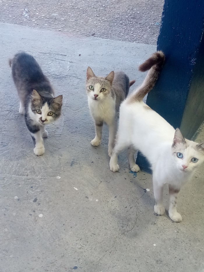 - "Three cats stand on a concrete surface" by FM-Q5qB73, licensed under CC BY 4.0