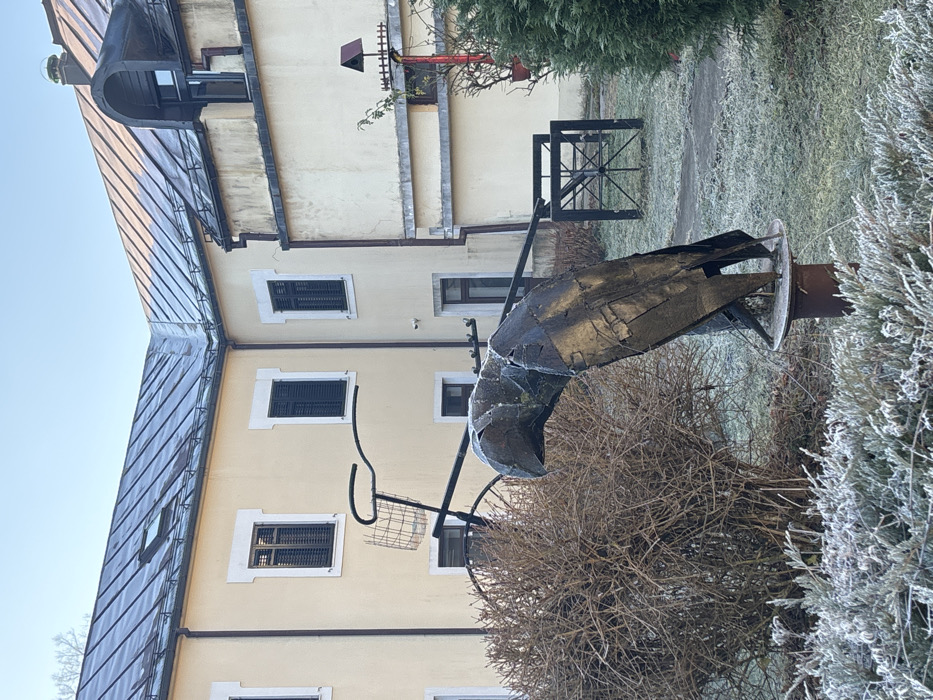 The image captures an outdoor scene in Cetinje, Montenegro, characterized by a frosty winter setting. In the foreground, a stylized metallic sculpture depicting an angular bird, possibly a raven, with prominent wings, stands on a dark cylindrical pedestal. Its upper surfaces are coated with a layer of white frost. Surrounding the sculpture are low evergreen shrubs and a dense, bare deciduous bush, all visibly covered in frost. The ground is a carpet of white, frost-covered short grass. In the midground, to the left of the bird sculpture, a tall, slender abstract metal structure resembling a bicycle frame with a basket is present. Further to the right, a black square metal framework rests on the frosted ground. Closer to the background building, a small, dark birdhouse with a pitched roof is mounted on a red pole, with a potted plant visible nearby. The background features a two-story building, primarily light yellow or beige, with a dark, multi-pitched roof. The roof, possibly metal, exhibits several skylights and a distinct dormer window with a rounded arch on the right side. The building's facade displays multiple rectangular windows, each fitted with dark, closed shutters and framed by light-colored trim. An adjoining section of the building to the right appears darker, featuring horizontal ledges and vertical piping. The sky overhead is clear and bright. No individuals are present in the scene.